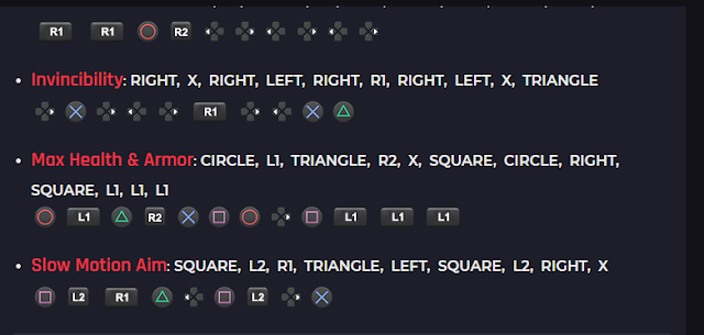 Invincibility RIGHT, X, RIGHT, LEFT, RIGHT, R1, RIGHT, LEFT, X, TRIANGLE