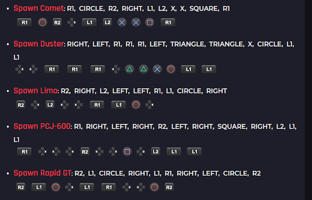 Spawn Rapid GT R2, L1, CIRCLE, RIGHT, L1, R1, RIGHT, LEFT, CIRCLE, R2