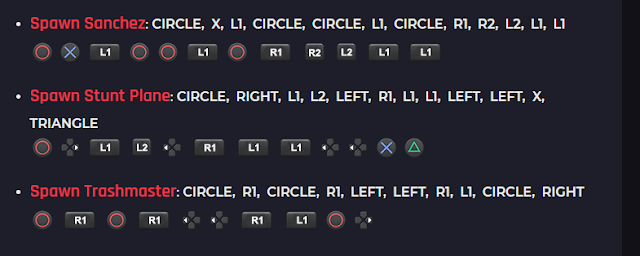 Spawn Stunt Plane CIRCLE, RIGHT, L1, L2, LEFT, R1, L1, L1, LEFT, LEFT, X, TRIANGLE